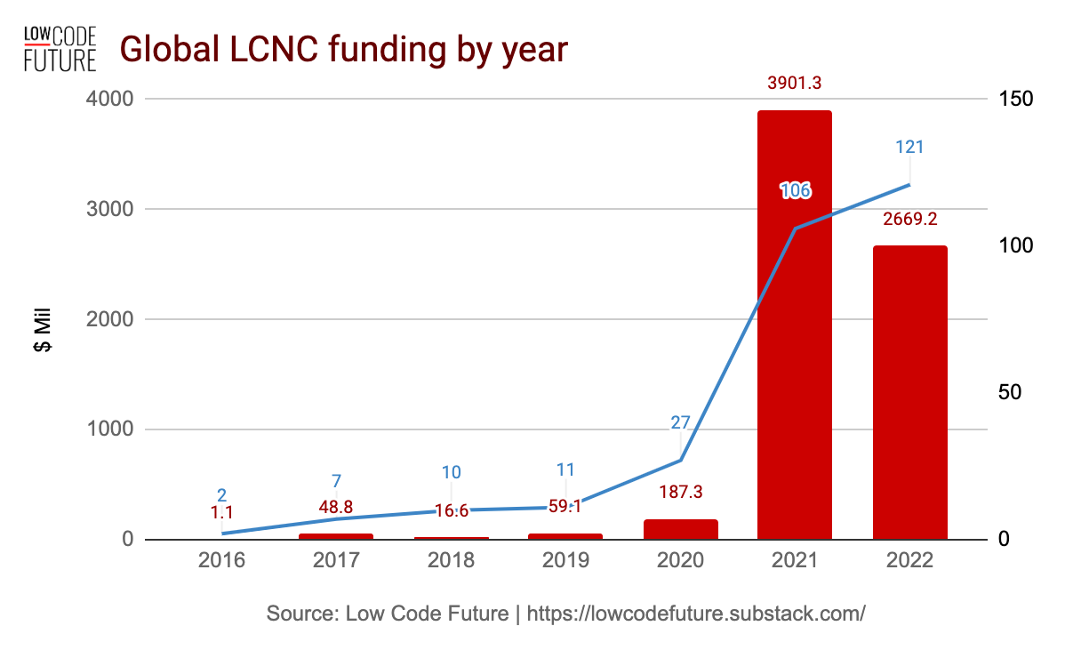 LCNC startups are on track to raise a slightly lower amount of capital than 2021, but certainly more companies funded (121 rounds this year, vs 106 in 2021).